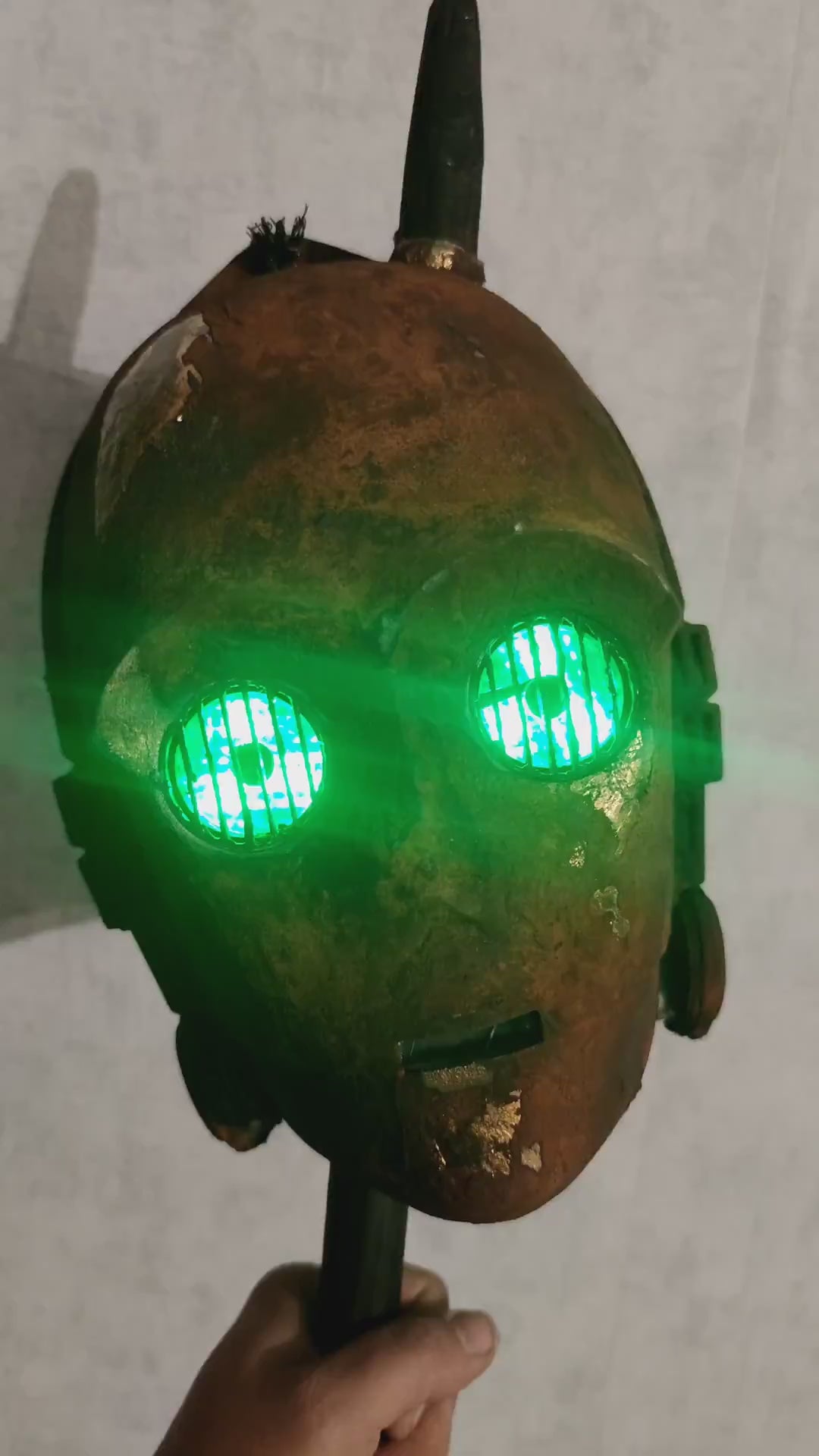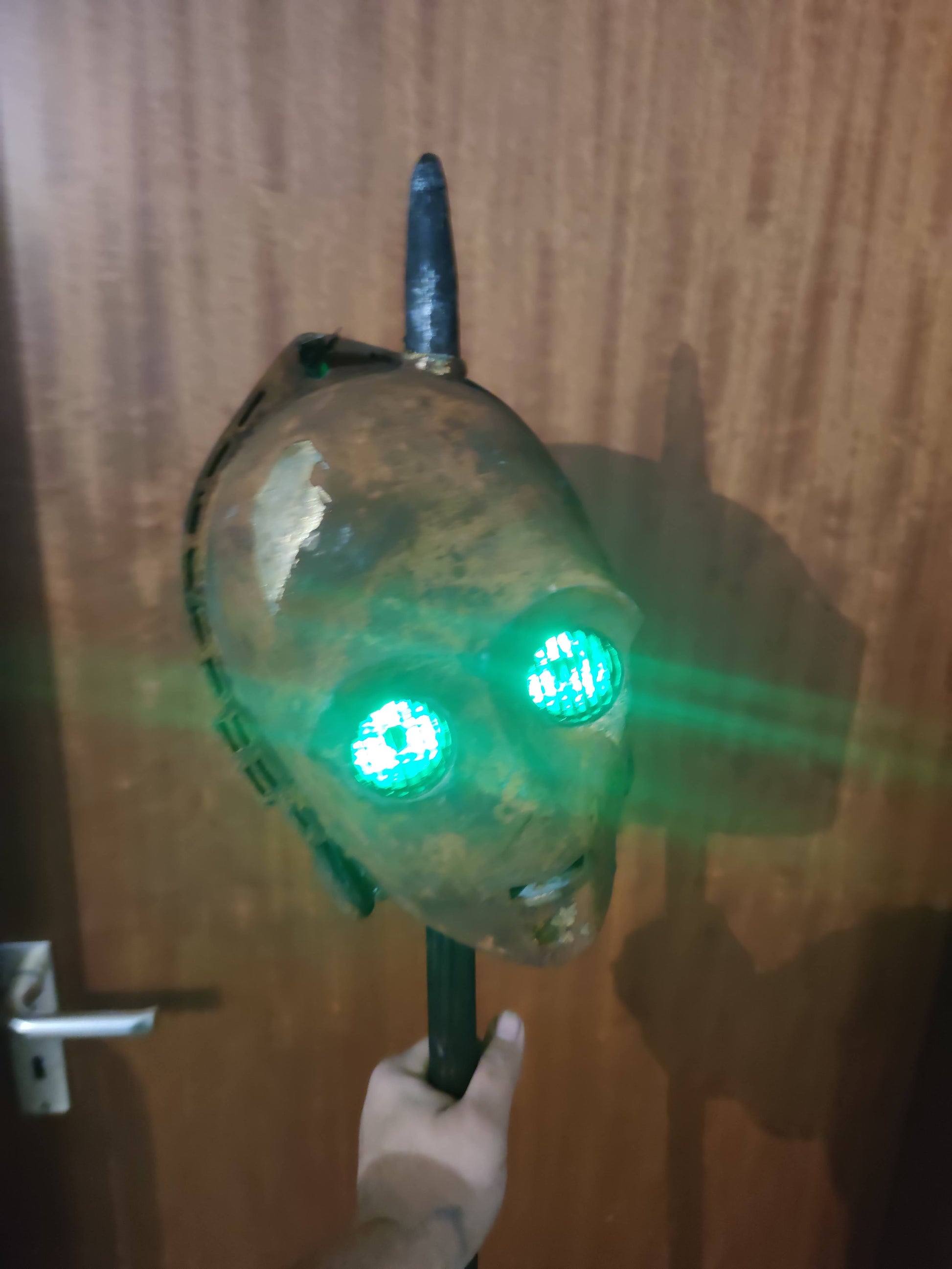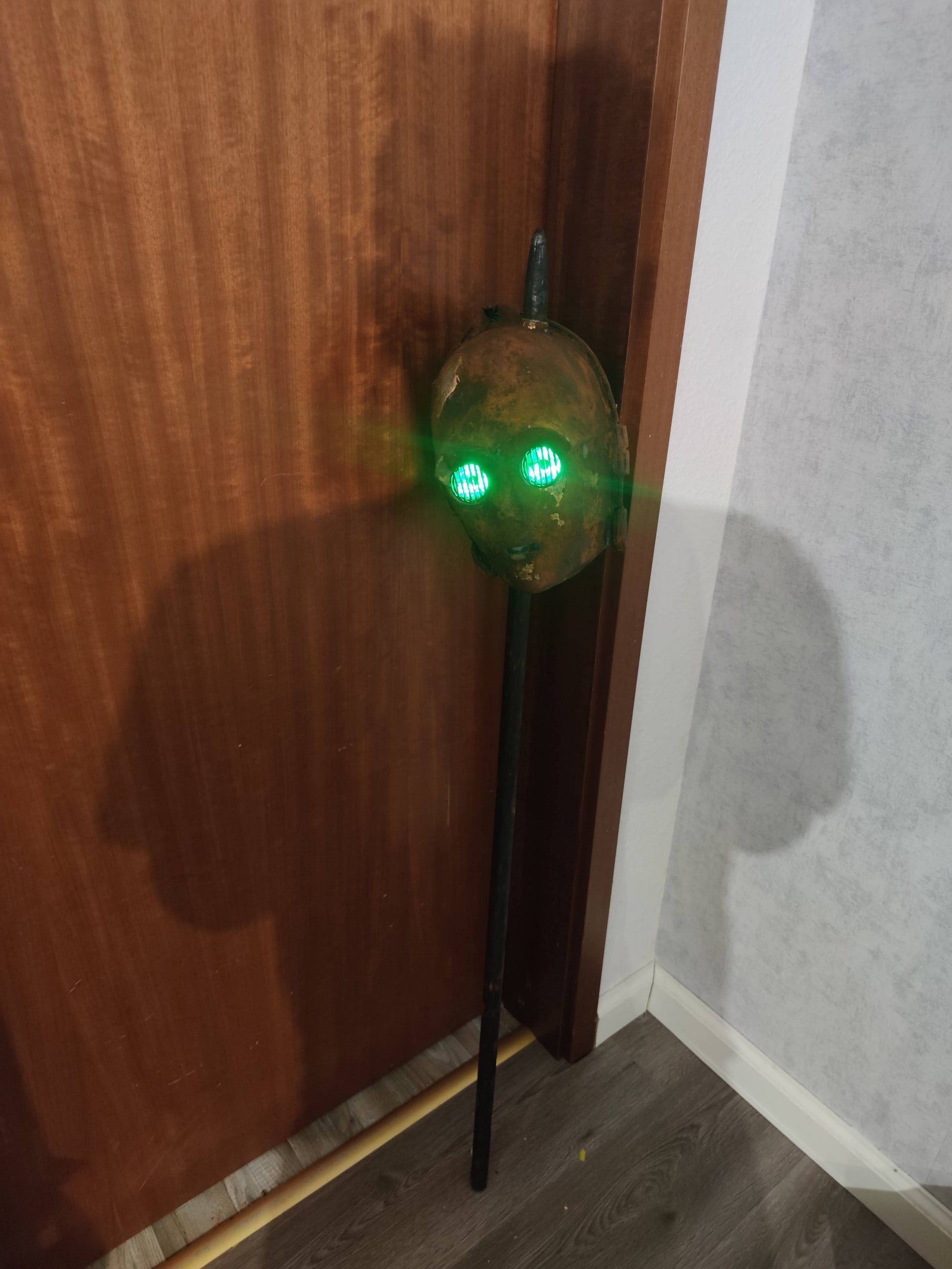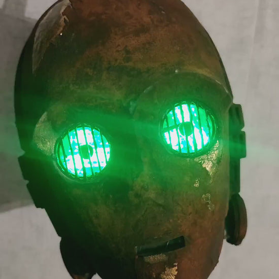 💡 Lebendige Elektronik – Die Augen sind mit LEDs ausgestattet und können flackern und ausfallen – so wirkt der Kopf, als stamme er direkt aus den Ruinen eines Droidenschrottplatzes.